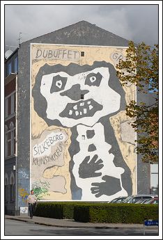 Oprindeligt er den franske billedkunstner Jean Dubuffets gavlmaleri lavet som litografisk oplæg til en plakat. Det blev også brugt som forside til et katalog. Det har kunnet tåle at blive reproduceret i alle 3 størrelser, endda så meget, at Silkeborg Kunstmuseums ledelse besluttede at restaurere gavlen for anden gang efter arbejdets tilblivelse i 1961.