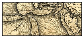 På kortet ses Dødemandsbjerg ud for spidsen af Skallingen, Grådyb, Fanø mod øst, Røde Klit Sand midt for og ragende ud mod vest Riffs Horn, altså Horns Rev. Efter Johs. Mejer og Caspar Danckwerts Neue Landesbeschreibung, 1650.
