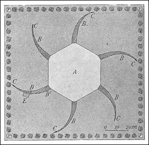 ![]() Grundrids af fuglekøje. A: Dam. B: Kanal, overspændt med net. B1: Tæmmekanal. C: Ruse. D: Skodde, der kan lukke for den snævre ende af tæmmekanalen. E: Tæmmekasse, der kan sættes i forbindelse med tæmmekanalen. F: Buskads (inderste rand). (Gengivet i såvel Salmonsens leksikon som i H.Chr.C. Mortensens Mærkede spidsænder. I: Dansk Ornithologisk Forenings Tidsskrift, 1913-14, årg. 8, hæfte 3, s.113).