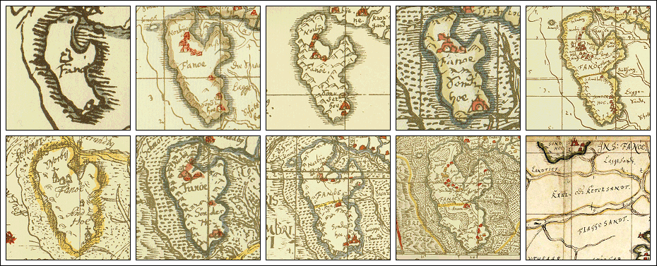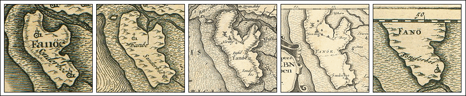 De 5 gengivelser af Fanø i Neue Landesbeschreibung der zwei Hertzogthümer Schleswig-HolsteinDe 10 gengivelser af Fanø i Kort over Det danske Rige