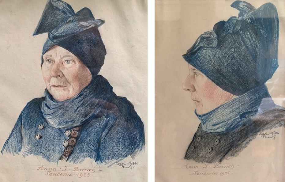 Efter Niels’ død i 1915 har Anne Jessine som enke i det store hus nok været alene, men hun har formentlig ikke været ensom i kraft af hendes engagement i Sønderhos ve og vel. Hendes eneste barn, Søren, var fuldmægtig i København, men hun har sikkert ofte fået besøg af ’pap’-familien, der boede i Sønderho, og hun må have været i kontakt med naboen mod øst, Erwin Nøbbe (1882-1948), der var kunstmaler og som i 1925 lavede de to billeder af hende, som ses her øverst på siden. Affotograferingerne af de to billeder er taget af Jens Brinch fra ’Janes Hus’, Vester Land 32. Billederne giver indtryk af en personlighed, der eftertænksomt reflekterer over sit liv og sin gerning.