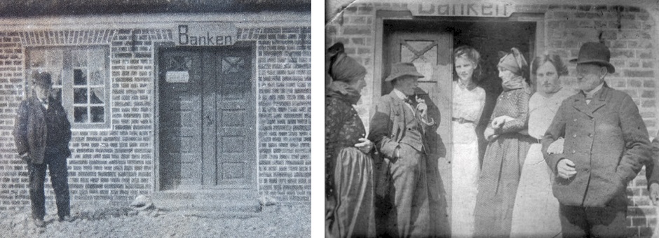 Der var ikke nogen sikret bankboks i huset, og efter sigende opbevarede Niels kassen med penge under gulvbrædderne; når det var tordenvejr tog han sin sydvest på og kassen med pengebeholdningen under armen, og satte sig udenfor til uvejret var overstået. På billedet står Niels med sin bowlerhat foran huset, hvor skiltet ’Banken’ hænger over døren; han står sammen Anne Jessine (’Oldemor’), barnebarnet Viggo Brinch, barnebarnet Anna Brinch, datteren af første ægteskab ’Store’ Anne Brinch og barnebarnet Ester Brinch.