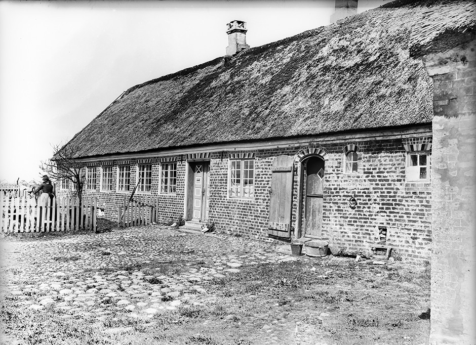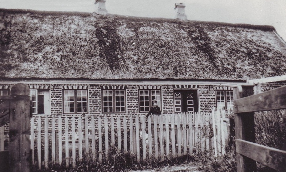 På ovenstående fotografi fra 1928 står Anne Jessine i haven ved vandposten. Bemærk hvor lidt bevoksning, der var omkring husene for ca. 100 år siden.