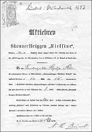 Aktiebrev for skonnertbriggen "Nielsine", der var bygget i 1872-73 på Abrahamsens skibsværft i Nordby. Det forliste i Nordsøen i 1893.