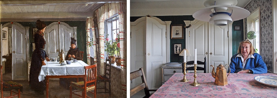 Stuen i oldemors hus. Til venstre Sigvard Marius Hansen's (1859-1938) billede "En fanøkone venter besøg. Oldemors stue" 1916 (Tilhører Fanø Kunstmuseum). Til højre Solveig Brinch (1921-2018) fotograferet samme sted i 2013.