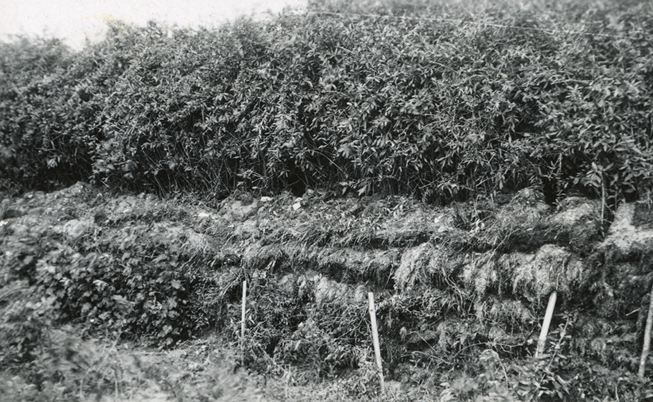 Dahliaer (georginer), som ser ud til at trives godt her, selvom der er temmelig skyggefuldt. Afslutningen udgøres af en gammel hyld. Bag denne udvider udsigten sig, vi ser ned i den forsænkede køkken- og frugthave, som mod omverdenen er omgivet af høje bukketornshække, og adskilt fra huset af en halv meter høj buksbomhæk. Græsset vokser helt ind til husets mur, og fortsættes af mos, som klynger sig fast i pudsen, men først kommer rigtig i vækst oppe på stråtaget.