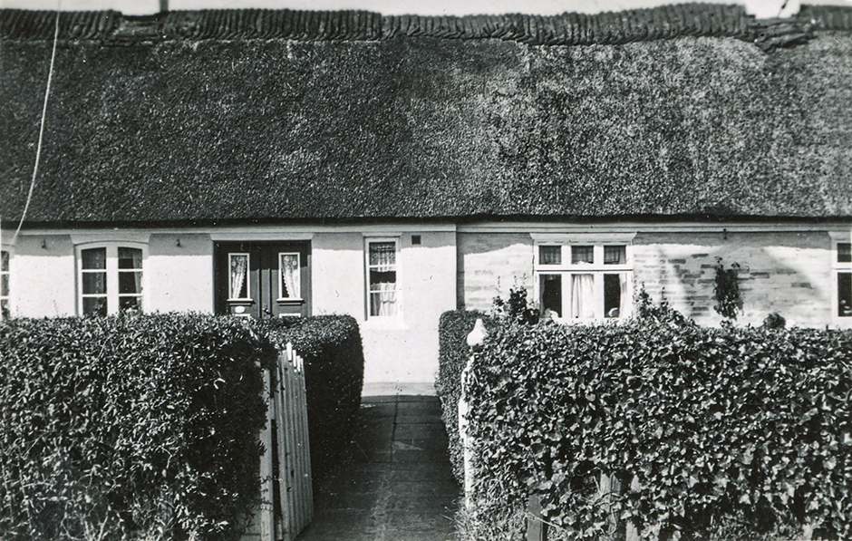 Fig. 1. Entrédøren ligger sjældent midt for gangen, som her er forskudt omkring en meter til højre. Dette ses igen og igen på Fanø, og da forskydningen altid sker mod øst, gives der næppe nogen anden forklaring end den, at det er vestenvinden, som lidt efter lidt har tvunget hækken til siden. Se også have nr. 6.