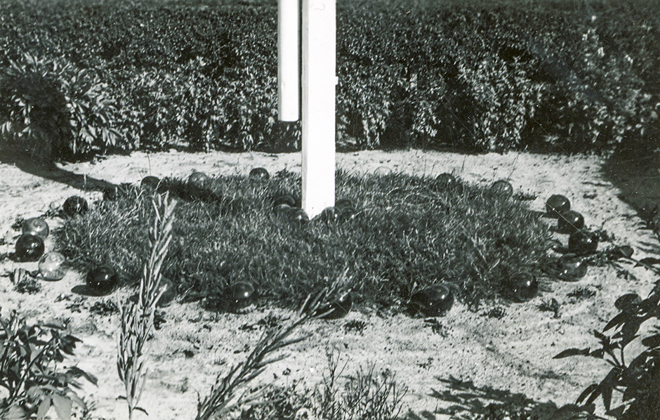 Det firkantede midterparti med flagstangen er tilsået med græs, og rundt om findes en hæk af krysantemummer. På bagsiden af huset finder man nogle rækker kartofler.