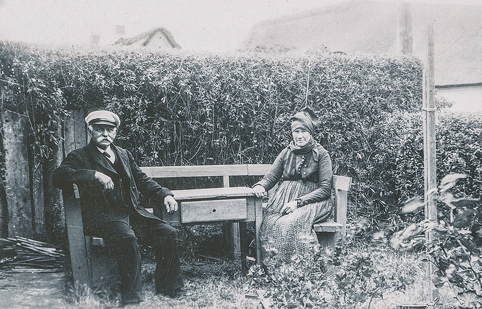 Inde i haven vokser barnebarnets frugttræer sammen med en række af bærbuske i læ af bukketornshækken. Nogle rækker gulerødder, rødbeder med mere savnes ikke, og på et stykke jord står roser og dufter. Længst væk findes siddepladsen, hvor kameraet har foreviget de to gamle.