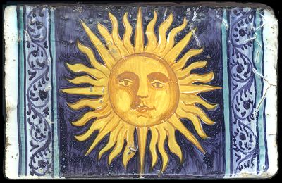 Renæssancens klassiske sol Keramisk polykromt glaseret flise fra Castelli i Abruzzien i Italien. Fremstillet omkring 1550. Motivet er renæssancens klassiske sol med ansigt. (16,8 x 10,5 cm). Kopi fremstillet af Farnese i Rom. |