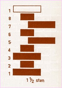 Vekslende løberskifter og kopskifter. Løberskifter er parvis forsat ½ sten for hinanden, således at hvert andet par af løberskifter er i lod. Alle løberskifter er forsat ¼ sten for kopskifter, og kopper er i lod i alle kopskifter. Forbandtkodens bredde er 1½ sten og dens højde 8 skifter. Aftrapningen er uregelmæssig med ¾ og 3 x ¼ stens spring. Fortandingen er uregelmæssig med ¼ stens spring.