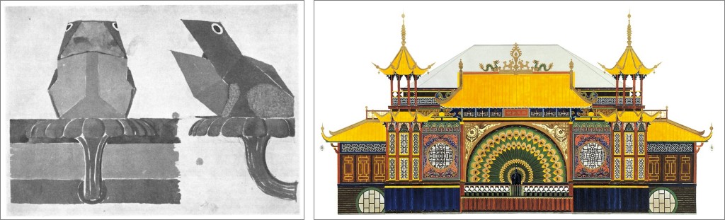 Samlekasse for regnvand udformet som en frø. Akvarelskitse af Hans Hansen. Herover Hans Hansen tegning af Pantomimeteatret.