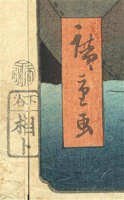 Utagawa Hiroshige (1797-1858), født Andõ Den japanske ukiyo-e kunstner Hiroshige er født 1797 i Edo, det nuværende Tokyo i Japan. Hans navn var oprindeligt Ando Tokutaro. På kunstakademiet fik han siden fornavnet Utagawa. Sammen med kunstnere som Sharaku, Harunobu og ikke mindst Hokusai hører han til blandt de yderst populære japanske kunstnere, der især i træsnittet har bragt japanske indtryk og kunst til Europa. Hiroshige II: Ichiyusai Shigenobu (1826-1869) Hiroshige II was a Ukiyo-e printmaker who worked under the name Shigenobu until the death of Ando Hiroshige in 1858. Upon the death of the master, who took him in as both a pupil and adopted son, he married Hiroshige's daughter and took the name "Hiroshige" (II). It is generally accepted that he completed works in progress from his master's studio, with fine designs being published through the early 1860's. About 1865, his marriage was dissolved ans he retired to Yokohama, reverting to the name of Shigenobu, where he painted pictures on tea boxes and lanterns intended for export. Hvor stammer de to træsnit fra? De to viste træsnit, der stammer fra min farmor og farfars hjem, er i sin tid indrammet (og købt?) hos Emil L. Olsen, glarmester og rammefabrik, Skindergade 22 i København. De bærer indramningsnumrene C 7230 og C 7231. Øverst på bagpappet til det ene tryk har min farfar med blyant skrevet "Hiroshige's 53 Tokaidostationer. Nr. 48." Jeg har har været stærkt i tvivl om, hvorvidt dette var rigtigt, men se Hans Olof Johanssons kommentarer senere.
