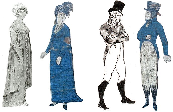 1800-1820 På låget er malet en mands- og kvindefigur, der formentlig skal forestille et brudepar. Spånæsker blev ofte givet som en gave til bruden, og ofte blev låget forsynet med brudeparrets navne eller initialer samt årstal. Svage farvespor hefra kan måske anes mellem den tyske inskription og brudeparret. Figurernes klædedragter viser at spånæsken må være fra omkring 1800-1820. Kvindedragten, gengivet i sort-hvid, stammer fra det engelske katalog 'Cabinet of Fashion' fra 1809. Den betegnes som en spadseredragt i pink musselin kantet med hvide kniplinger. Uden på hvid musselin kåbe kantet med gul silke. Se også Le Beau Monde 1807 Mandsdragten, gengivet i sort-hvid, beskrives som grå 'herrekjole' (tail coat). Lysebrune knæbukser og sorte støvler. Sort tophat. Handsker. Fransk mode gengivet efter maleri i Louvre 1819. Se også Regence Timeline in Fashion and Events. www.aldus.dk. . 30. juni 2004. |